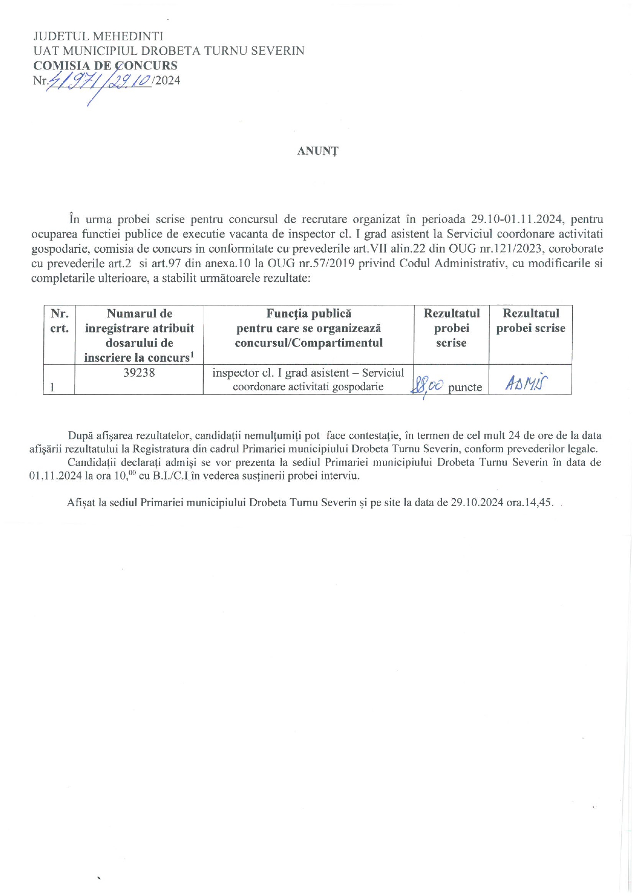 Anunt rezultat proba scrisa la concursul din perioada 29.10 – 01.11.2024